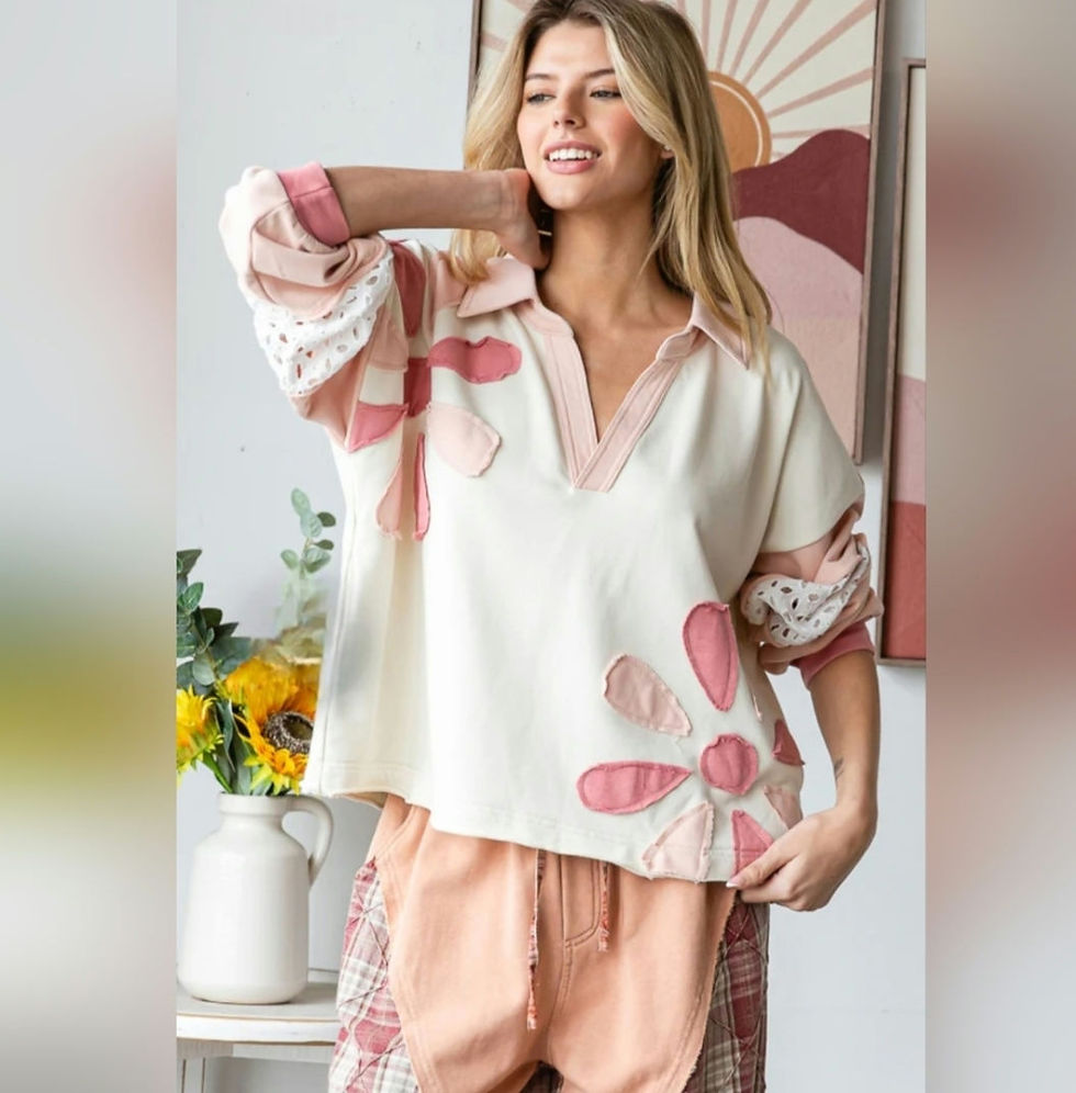 WASHED DAISY PATCHWORK V-NECK LONG SLEEVE TOP