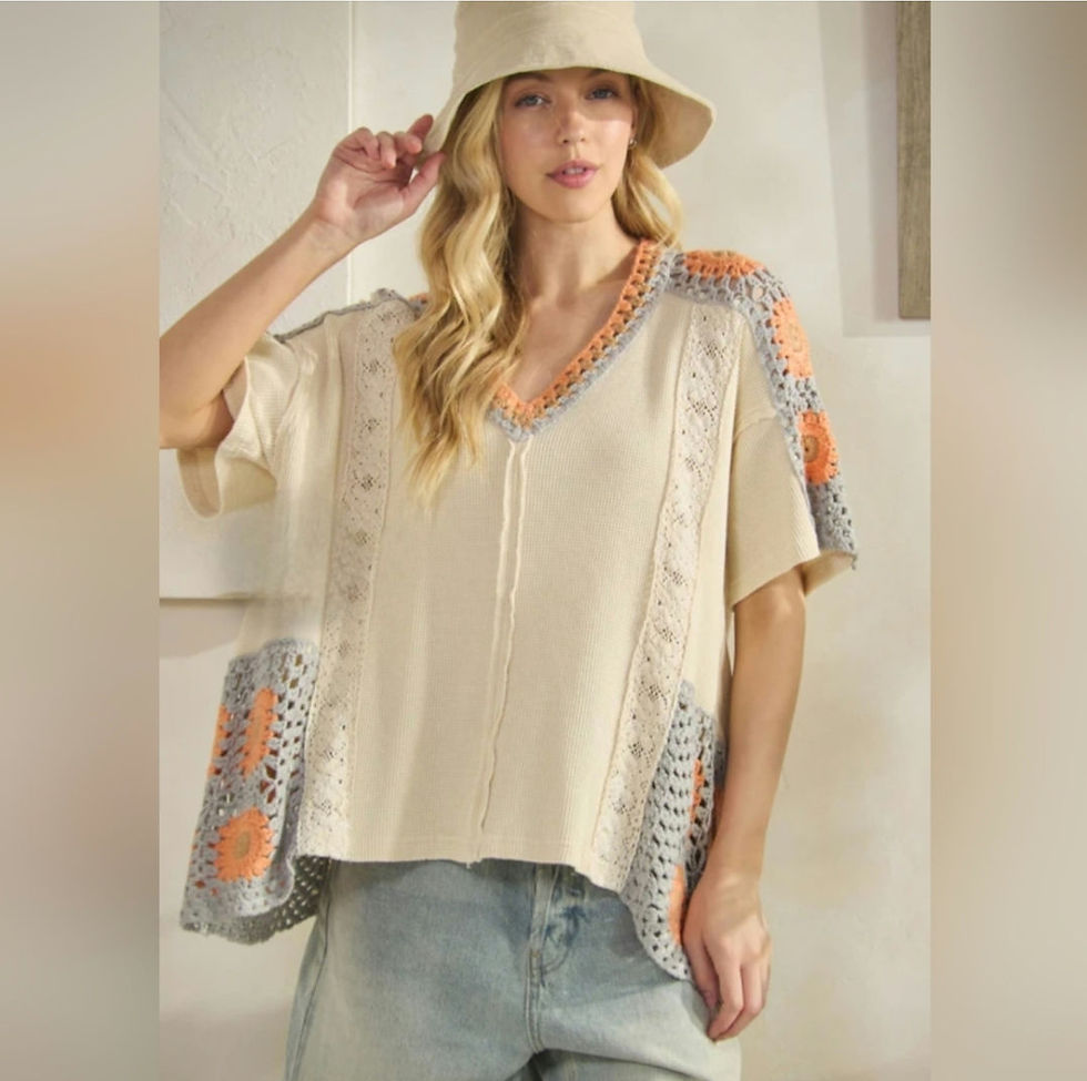 WASHED V NECK CROCHET CONTRAST SHORT SLEEVE TOP